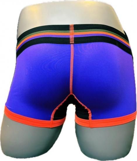 【情熱的なコントラストと個性の主張】 深みのあるディープパープル(紫)のボディが、見る者を惹きつけるボクサーパンツ。パープルと、鮮烈なネオンオレンジのトリミング、そして股部分の漆黒の切り替えが、まるで夜のネオン街のような、挑発的でエッジの効いたコントラストを描き出します。